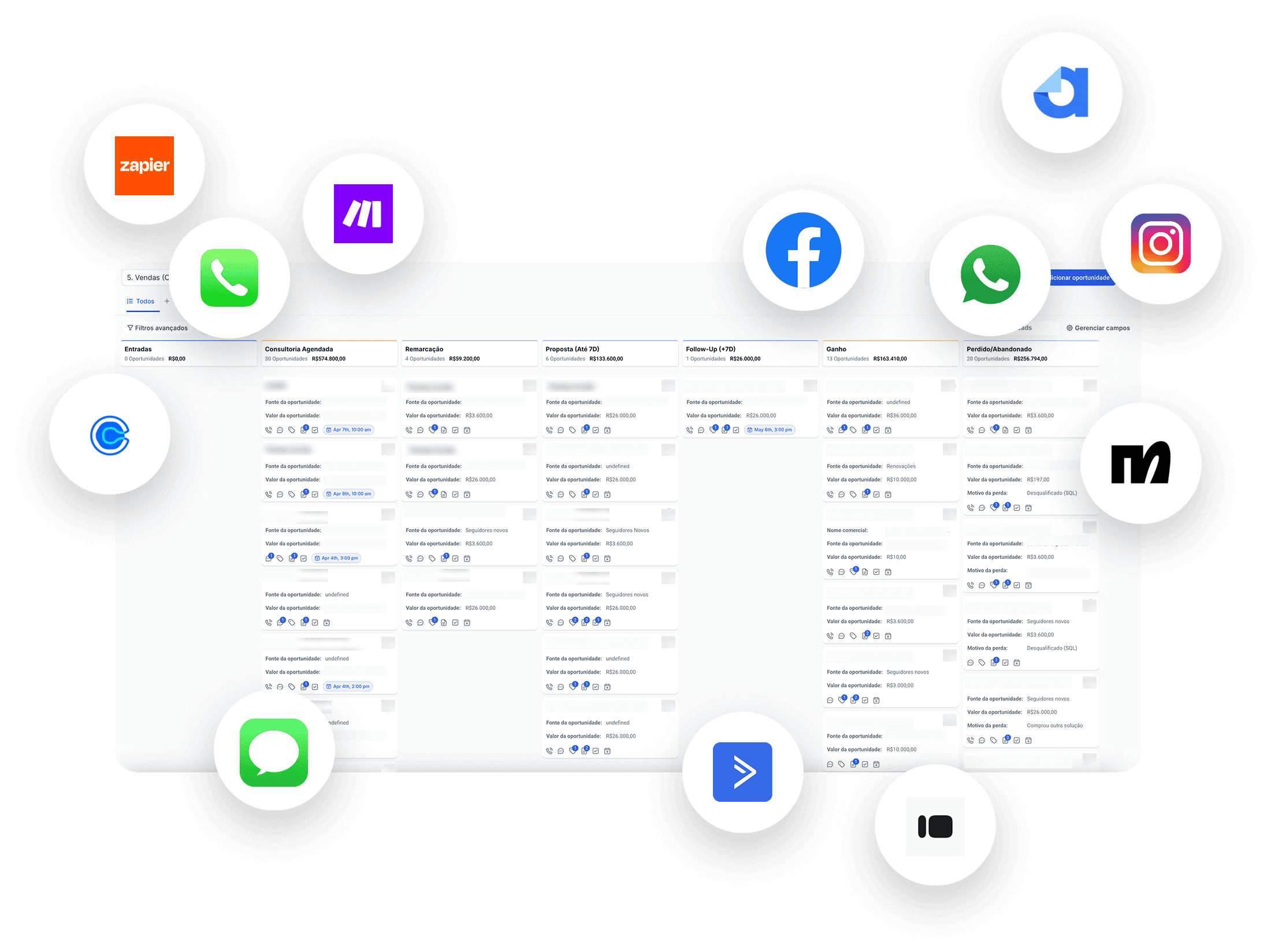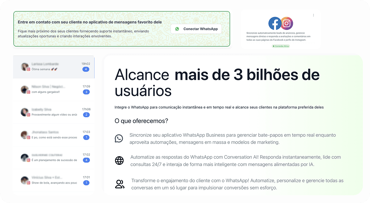 Integre conversas do WhatsApp, Instagram, Formulários, Automações, Grave Ligações